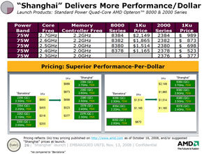 Il était attendu depuis longtemps et le voici enfin: le nouveau quad core gravé en 45nm d'AMD. Par contre comme à son habitude la marque privilégie pour commencer le marché des serveurs, les Denebs grand public devant a priori arriver d'ici 2 mois. On commence donc avec pas moins de 8 Opterons, décliné en versions allant de 2.3 à 2.7GHz et qui commencent à un prix de 377$ par 1000 unités. Selon AMD la consommation serait inférieure de 35% à celle de la génération précédente gravée en 65nm, les performances grandement améliorées grâce au cache L3 qui passe de 2 à 6Mo. Une information importante: ces nouveaux Opterons sont compatibles avec les cartes mères "Phenom FX", le socket n'ayant pas été modifié par AMD. A noter qu'Anandtech propose un court test de la nouvelle architecture.