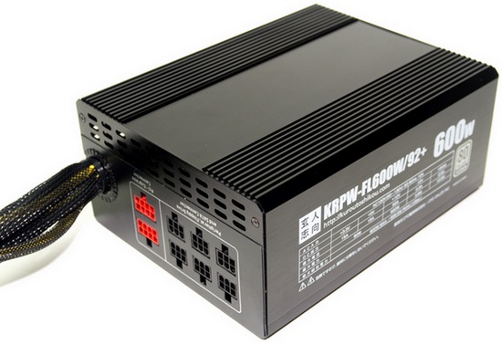 La KRPW-FL600W/92+ est une alimentation de 600 W certifiée 80PLUS Platinum au monorail 12 V. Son ambition d'alimenter un Crossfire ou un SLI de façon passive ne peut se faire sans un radiateur impressionnant et des composants haut de gamme. Alors il vaut mieux ne pas se la faire tomber sur le pied, la bestiole fait son poids (3,46 kg emballée). Elle est semi-modulaire : le 20+4 pins, le 4+4 pins CPU, un PCIe 6+2 pins et un 6 pins ne sont pas détachables. Le rabe est composé de deux autres connexions pour carte graphique (6+2 pins et 6 pins), de 6 SATA et 3 molex. Bref, de quoi alimenter un sérieux PC gamer !
