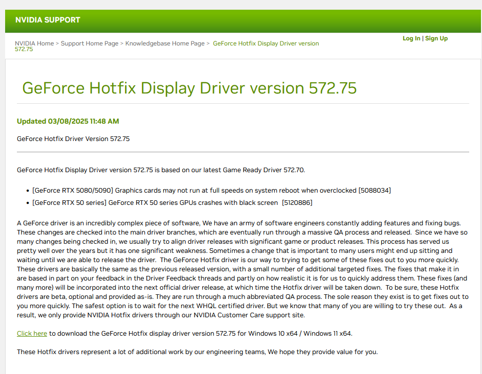 Ne soyons pas médisants : les instabilités affectaient majoritairement les RTX 5090 et RTX 5080, mais des détenteurs de RTX 40 se sont également manifestés. Concrètement, il semble que bon nombre des défaillances soient imputables à la branche 572 des pilotes. En particulier au pilote GeForce 572.16 déployé le 30 janvier dernier pour la sortie des deux premières Blackwell. Depuis, le 572.47, paru à l’occasion de la commercialisation de la GeForce RTX 5070 Ti, n’a rien amélioré (il n'a corrigé qu’un unique bogue en lien avec des problèmes de stabilité lors du du réveil du moniteur après une période de veille prolongée). Comme souvent, des utilisateurs ont suggéré de nombreux expédients. Pour les RTX 50, la stratégie consistant à rétrograder le support PCIe aurait fonctionné chez certains.
