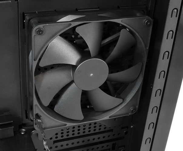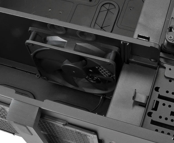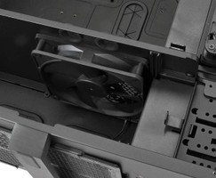 Pour ce qui est de la zone principale du 800D, celle de la carte mère et des composants que l'on branche sur elle (CPU, RAM, CG etc...), la ventilation se devait d'être plus conséquente et c'est ce qu'a fait Corsair en y dédiant 2 ventilateurs de 140mm de diamètre. Le premier se situe sur le fond qui fait office de séparation entre le compartiment alimentation et celui de la configuration. Il aspire de l'air frais dans le compartiment alimentation, et donc sous le boîtier, pour l'insuffler par le bas de la carte mère. Un second 140mm est lui classiquement placé à l'arrière du 800D pour aider à l'extraction de la chaleur emmagasinée lors du passage le long des composants. A noter que 3 ventilateurs 120mm peuvent également être ajoutés au sommet du boîtier pour encore aider au refroidissement de cette zone.