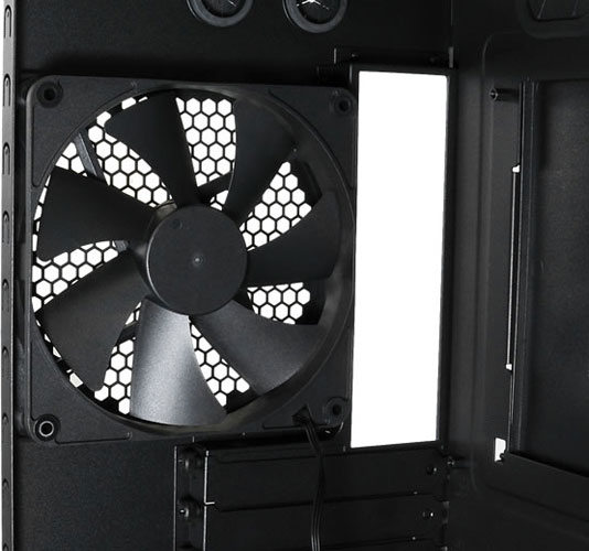 Enfin, le dernier ventilateur est dédié à la cage à HDD "hotswap". Masqué derrière un cache pour le séparer du compartiment "configuration", il aspire l'air une fois encore dans le compartiment inférieur et donc par le dessous du boîtier, pour le souffler vers les disques. Et là Corsair a étudié la chose afin de créer un circuit d'air qui fait circuler l'air (faiblement) réchauffé par l'arrière du panneau de la carte mère, pour finalement ressortir par la face arrière du boîtier via la bande verticale grillagée dont nous parlions en page précédente ! L'utilité sera sans doute toute relative à moins de posséder 3 ou 4 disques durs ayant tendance à chauffer, mais la réflexion apportée à cette conception mérite d'être saluée !