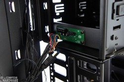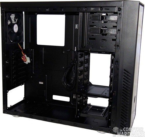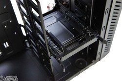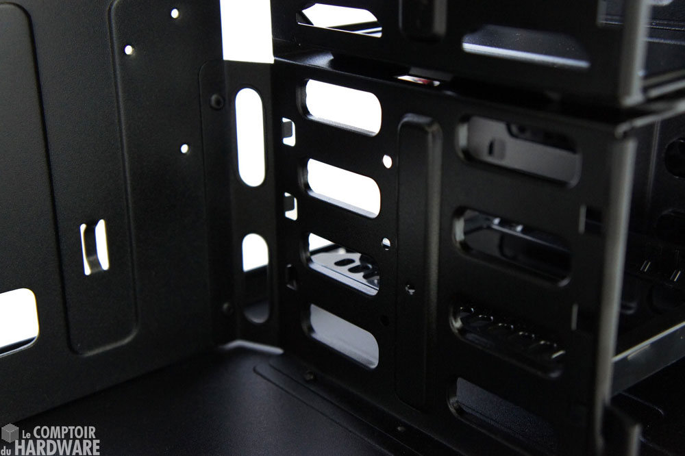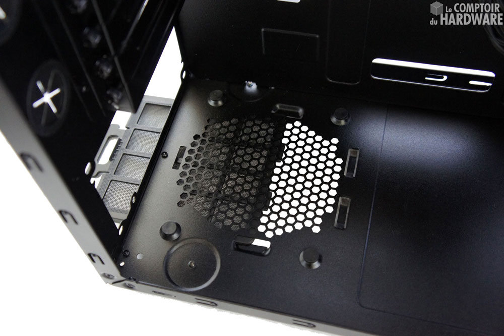 Juste en dessous de cette cage amovible se trouve la partie fixe, permettant d'installer trois unités de 3,5" supplémentaires. Cooler Master abandonne la petite baie pour unités de 2,5", mais n'oublie pas de livrer l'adaptateur 2.5" vers 3,5" pouvant accueillir deux SSD. Le fond du boitier n'est pas recouvert de mousse et l'emplacement prévu pour l'alimentation est équipé de patins en caoutchouc.