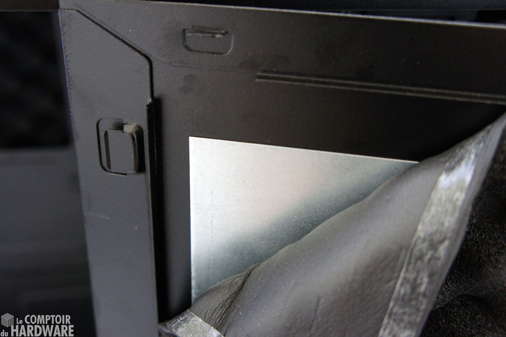 Pour accéder aux entrailles du boitier, il faut enlever la porte latérale gauche maintenue par deux vis à main. Cette portière pèse son poids puisqu'elle possède trois épaisseurs: une première couche d'acier constitue la porte elle-même, une plaque en acier vient ensuite recouvrir une grande partie de l'espace, et enfin une couche de mousse acoustique diffusante termine le blindage; de quoi, espérons-le, retenir toutes les nuisances sonores ! La seconde porte latérale subit le même traitement.