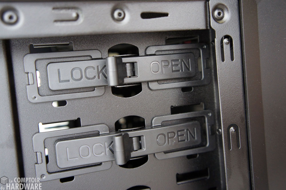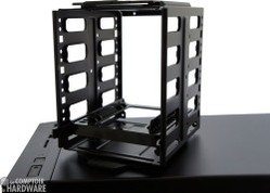 L'intérieur du châssis ressemble à ce que nous avons déjà vu sur le HAF 912. La partie de droite est occupée par les deux baies de 5,25", toujours équipées du système de fixation rapide, et le dock HDD sur la partie supérieure. En dessous se trouve une cage amovible et orientable pouvant accueillir quatre unités de stockage de 3,5".