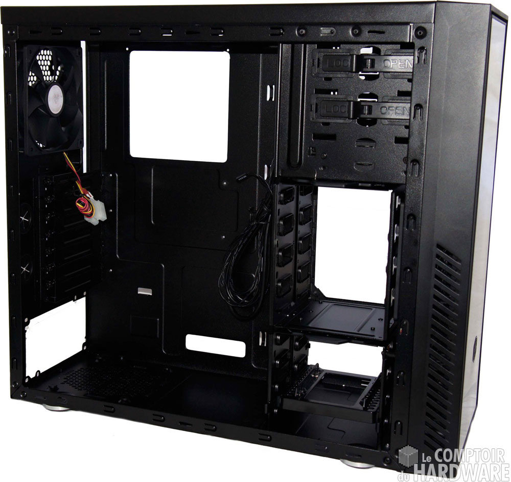 Le panier de carte mère, fixe, peut accueillir des modèles au format ATX ou µATX. Il est équipé d'un accès backplate assez grand, mais perd plusieurs passes-cloison qui étaient très pratiques pour le rangement des câbles. Il conserve cependant les trous permettant de passer le câblage de l'alimentation derrière le panier, un accès pour le câble EPS 12v et un unique passe-cloison sur le haut du plateau. Nous remarquons également que le haut du châssis n'est pas recouvert de mousse acoustique.