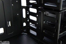 L'arrière est aussi familier. Nous y retrouvons les sept slots d'extension, qui ne sont toujours pas équipés de systèmes de fixation rapide, mais gagnent ici des vis à main plus pratiques. Les passes-cloison pour les tuyaux de refroidissement à eau et le ventilateur d'extraction sont également présents. L'espace disponible dans le châssis permet l'installation de ventirads de 15,4 cm de hauteur, ainsi que la mise en place de cartes graphiques jusqu'à 42,7 cm une fois la cage de HDD et un ventilateur préalablement enlevés.