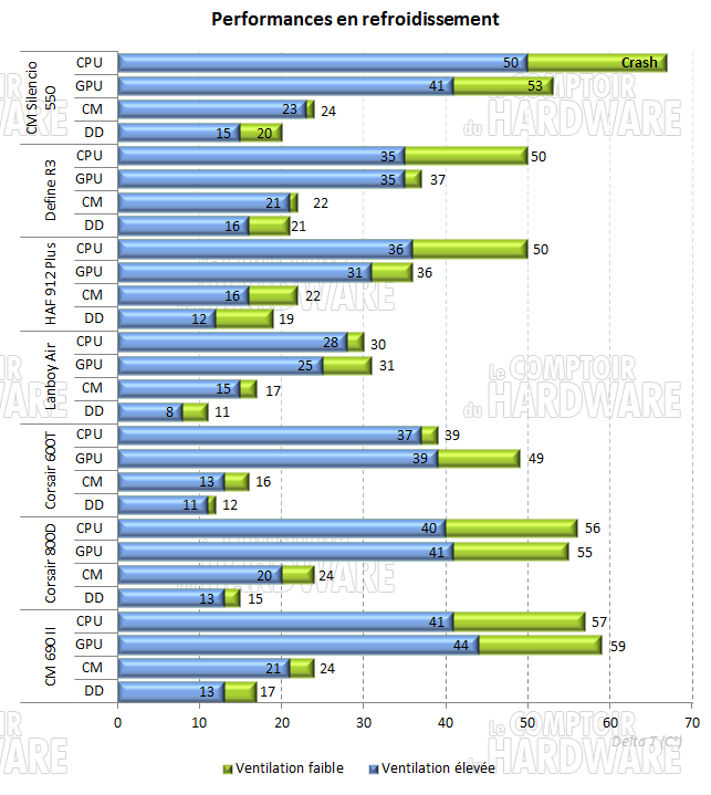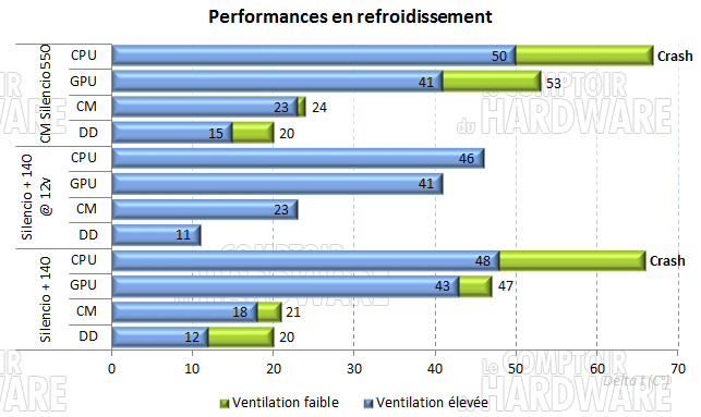 La ventilation du boîtier se doit dans ces conditions d'aider toute la configuration pour éviter la surchauffe, voici les résultats que nous avons obtenus avec le CM Silencio 550 (ventilation au minimum puis au maximum). Les résultats sont exprimés en Delta T, c'est à dire en écart par rapport à la température ambiante. Enfin, nous comparons les résultats obtenus avec ceux des précédents modèles testés. Notez qu'en l'absence de potentiomètre sur certains, nous avons effectué nos relevés en forçant la régulation en 5V puis en 12V :