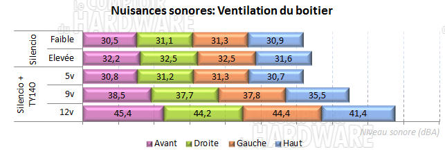 Nous procèderons au relevé des nuisances sonores dans un premier temps, puis nous relèverons les températures par la suite, comme indiqué dans le protocole de base. Nous réaliserons cependant une mesure supplémentaire avec le ventilateur de 140mm alimenté en 12V (1300tpm) afin de mesurer les répercussions sur les nuisances sonores et le refroidissement.