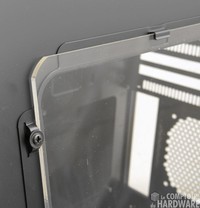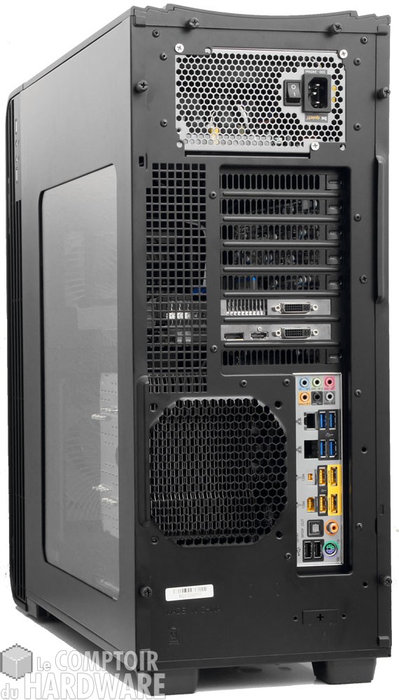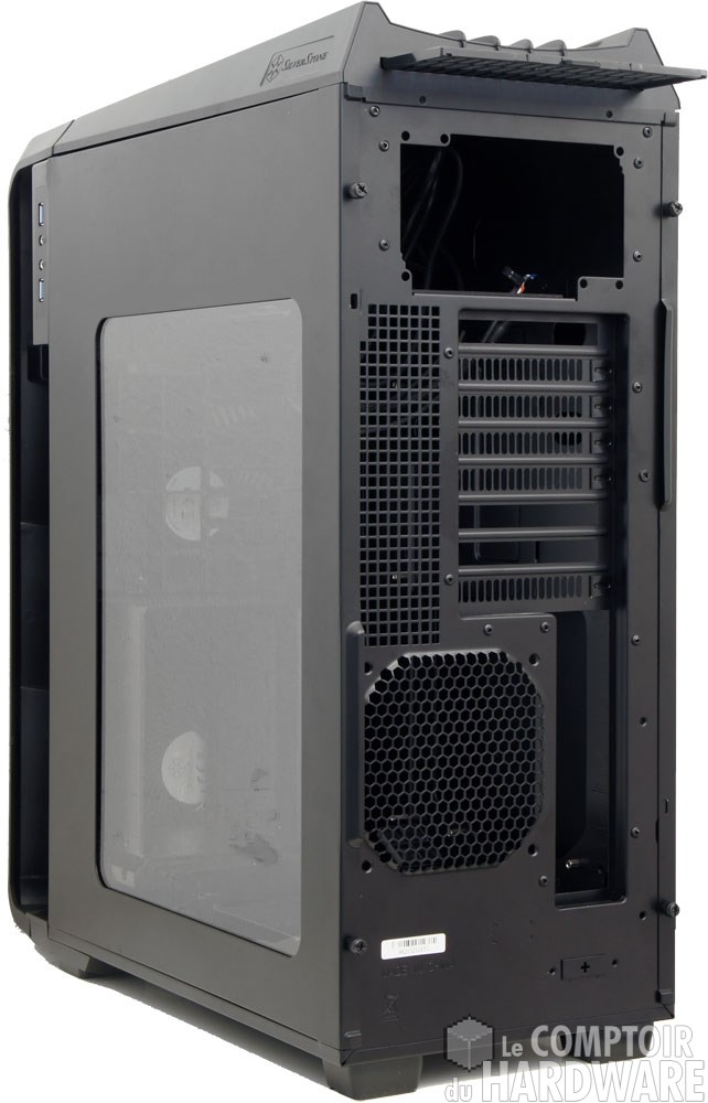 À l'arrière vous trouverez tout ce qu'on voit habituellement sur un boitier moderne, mais à l'envers : alimentation en haut, slots d'extension au nombre de huit et placé au centre, emplacement pour ventilateur de 120mm sur le bas. Sur le panneau droit du boitier, vous découvrez une large fenêtre qui permet d'admirer comme il se doit votre beau matos. Cette vitre est très solide grâce à son épaisseur de près d'un demi-centimètre. Si vous n'êtes pas pour exhibitionniste, il existe un modèle sans vitre. Sur le panneau gauche, il ne se passe rien de passionnant. Les deux ouvrants sont maintenus à l'aide de vis à main.