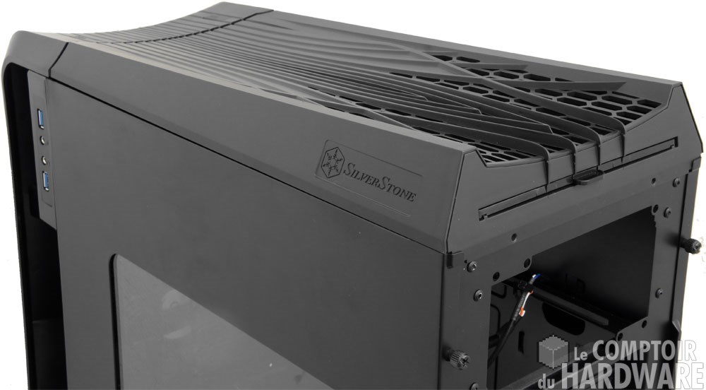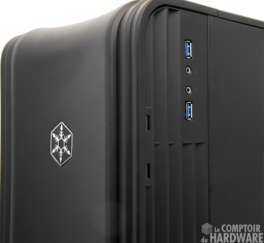 Les baies externes justement sont au nombre de deux et sont protégées par des caches en plastique. Sur la tranche droite, vous trouverez les connectiques externes. SilverStone met à disposition le strict minimum avec deux ports USB 3.0 et les entrée/sortie audio. Les boutons de mise sous tension sont quant à eux intégrés dans la porte et placés sur le dessus.