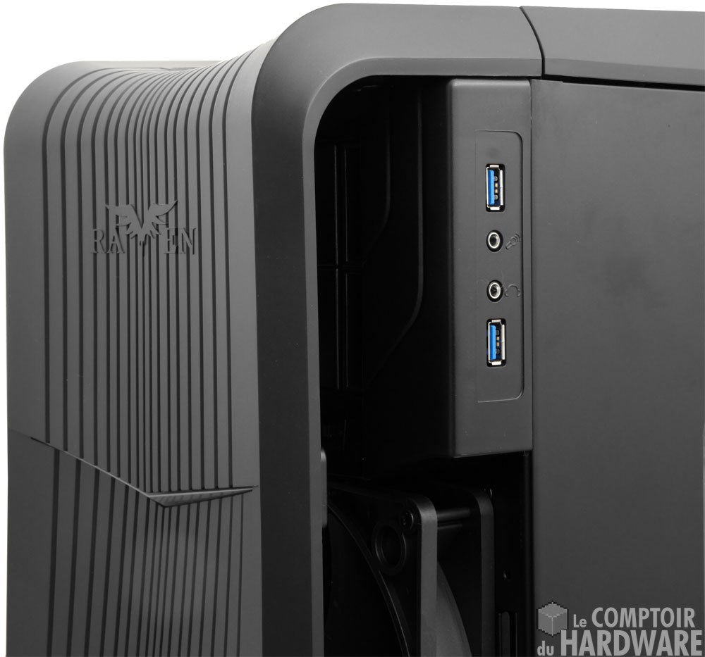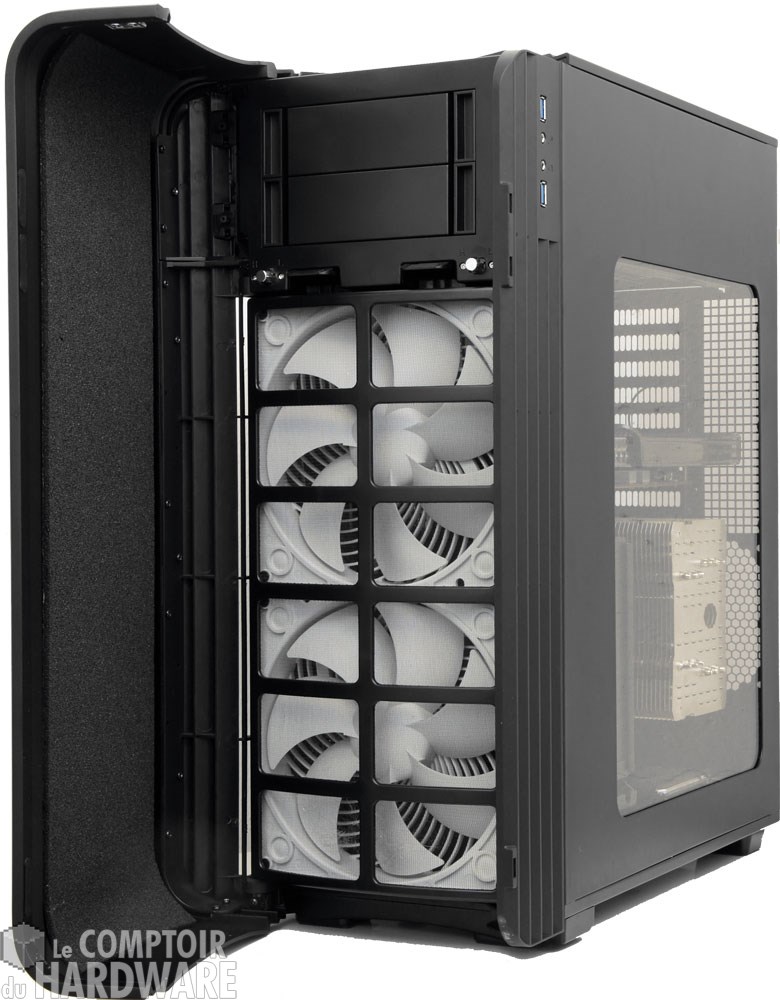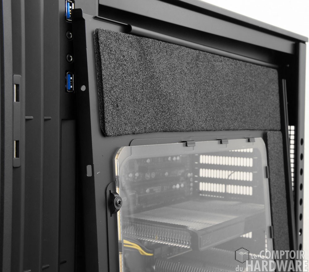 Sur l'intérieur de la porte, vous pouvez voir la couche de mousse acoustique installée là. De faible épaisseur, elle ne semble pas très efficace, mais seuls nos tests nous le diront. Le front panel, ou plutôt side panel, est toujours composé des deux ports USB 3.0 et des I/O audio sur la tranche droite de la porte avant. Les boutons de mise sous tension sont par contre ici déportés sur la tranche gauche.