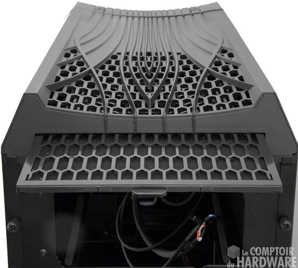 Le top comme vous pouvez le voir est également travaillé. Il est tout incurvé et possède une aération sur l'arrière. Cette aération, qui est destinée à laisser respirer l'alimentation, se voit équipée d'un filtre amovible afin d'éviter que les poussières n'entrent. Le capot supérieur s'enlève complètement afin de pouvoir effectuer le montage des éléments (Alim et ODD). Il est fait de plastique solide, avec le logo de la marque gravé sur les côtés et est également fixé par des vis à main.