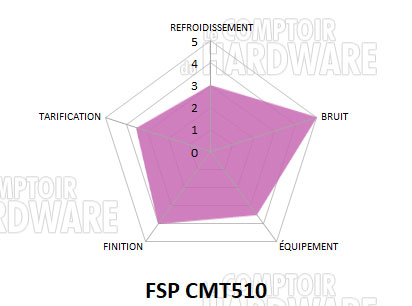 La tranche 89/109€ est très disputée. Plusieurs modèles se livrent une guerre acharnée dans cette gamme de prix et offrent leur lot de bonnes choses, mais ils n'auront pas tous du verre trempé partout. Affiché à 99.90€, le CMT510 reste abordable pour le segment qu'il vise, c'est-à-dire les boîtiers vitrines. Il trouvera sur sa route l'Alpha 330 de Lian Li (130€), le Crystal 460X RGB de Corsair (145€) ou encore l'AI-Crystal de chez Anidees, premier modèle du genre (140€). La solution de FSP s'avère alors très abordable, sans avoir à rougir face aux modèles concurrents.