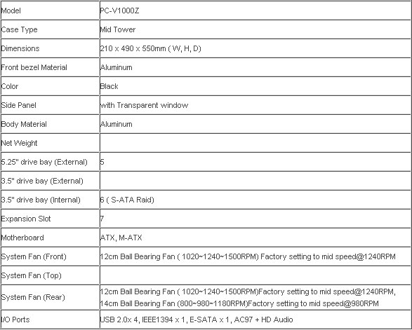 Une information manque à l'appel sur cette fiche de caractéristiques: la masse du PC-V1000Z. Nous l'avons mesurée à 8.1kg, une valeur donc très raisonnable pour un boîtier de ces dimensions. L'aluminium n'y est bien sûr pas étranger ainsi que la conception en "metal mesh" que nous allons maintenant détailler.