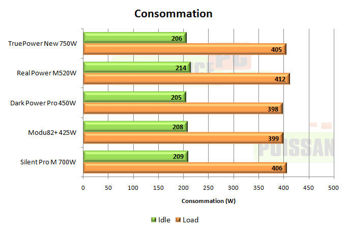 La consommation est bonne mais ne se distingue pas spécialement de la concurrence, preuve qu'il n'y a pas forcément de réelle différence entre un modèle 80Plus "nomal" et 80Plus Bronze, la température de l'air expulsé dans la bonne moyenne, et pour finir à 375W donc 50% de charge, le ventilateur commence, comme on pouvait s'y attendre, à accélérer, pour le moment de manière très raisonnable avec 40dB ce qui reste au niveau des toutes meilleures.