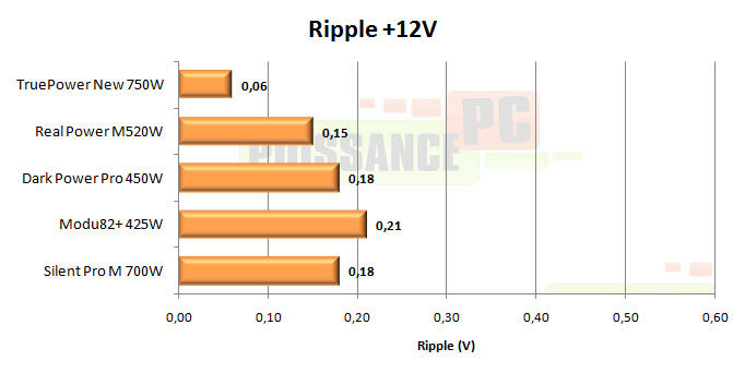 Le challenge commence vraiment avec la configuration haut de gamme et ses 375W en charge. Nous sommes à 50% de la charge totale de notre TP-750, et tout de suite l'alimentation d'Antec frappe un grand coup avec un +12V qui reste diablement stable. Comme nous vous le disions en présentation, c'était cette stabilité qui avait initialement fait la réputation de la série "TruePower", et Antec semble avoir tout fait pour que la TruePower New ne change pas ce fait, avec ces fameux modules de régulation qui semblent faire très bien leur travail.