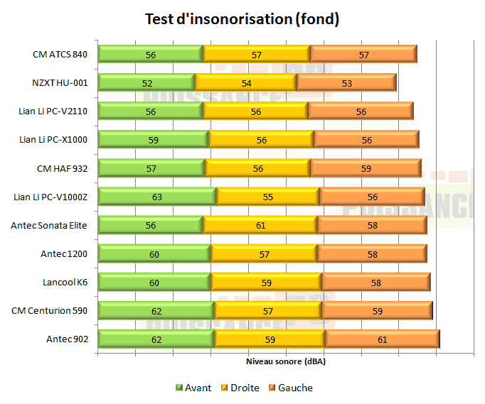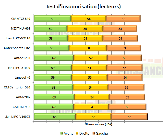 Nous commençons donc nos tests avec la capacité d'insonorisation du boîtier. Pour rappel une source sonore de 64dbA (mesuré à 15cm) est introduite dans le boîtier au niveau des lecteurs, puis directement au fond de celui-ci, et des relevés sonores sont faits à 15cm du boîtier à l'avant et de chaque côté. Cela nous permet ainsi de comparer les capacités d'insonorisation des boîtiers en eux-mêmes, sans lien avec la ventilation, qui diffère d'un modèle à un autre.
