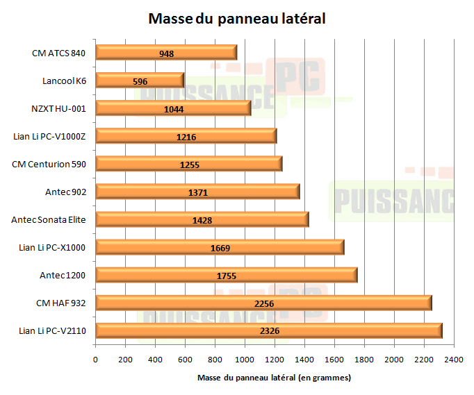 Nos soupçons se portent bien entendu immédiatement vers un point que nous avions relevé lors de l'analyse intérieure du boîtier : la finesse des panneaux latéraux, un choix rarement payant quand on opte pour de l'aluminium. Pour vérification nous avons pesé le panneau latéral droit de l'ATCS 840 et l'avons comparé aux masses des autres panneaux de nos modèles testés pour voir si des tendances se dégagent: