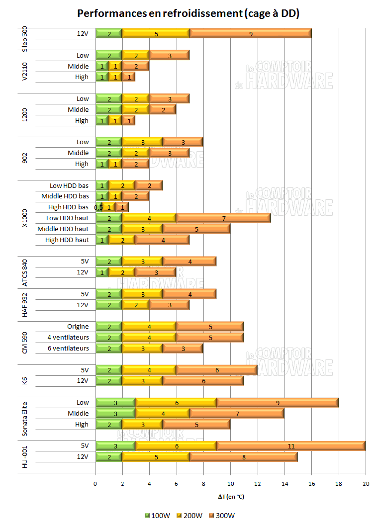 Très bonnes avec la source de chaleur de 100W, et encore tout à fait acceptable avec celle de 200W, les performances en refroidissement au niveau de la cage à disques durs du bas ont tendance à s'effondrer tout de même avec 300W. L'explication tient en cette ventilation faible du Sileo 500. Avec des 120mm 800tpm, peut d'air est brassé, et de plus avec peu de "pêche". La source de chaleur de 300W, c'en est trop pour le Sileo, et l'air n'arrive plus à sortir. Il stagne dans la tour, imprègne la mousse qui était brûlante après les séries de tests, et donc fini par, malgré le flux d'air classique de l'avant/bas du boîtier à l'arrière/haut de celui-ci, rebrasser même vers le niveau des disques durs après avoir déjà envahi le reste des zones de la tour.