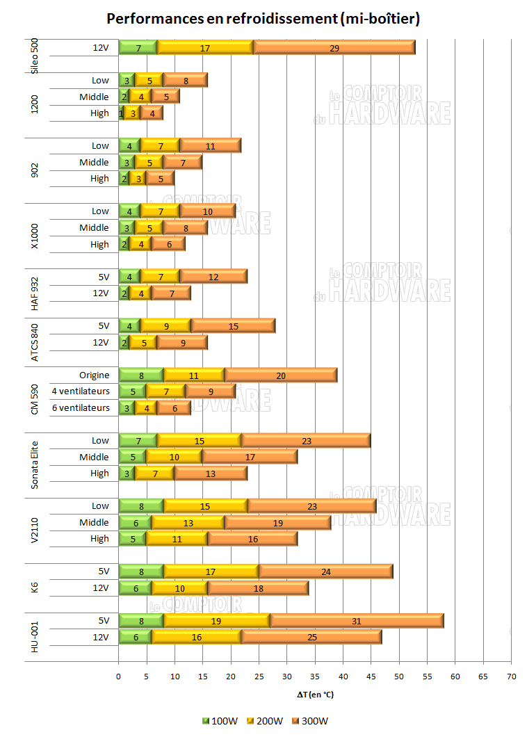 Confirmation des difficultés du boîtier avec cette fois les performances les plus importantes, celle à mi-boîtier au niveau de notre carte mère donc. Avec 100W de chaleur toujours pas de souci, sans bien sûr atteindre les performances des ténors de la ventilation, le Sileo 500 parvient à assurer l'essentiel. Mais dès 200W les choses se corsent avec une augmentation de la température interne de 17°C. On reste tout de même malgré tout dans des valeurs encore acceptables, aucun souci, mais par contre les 300W sonnent bel et bien le glas de notre Sileo 500...