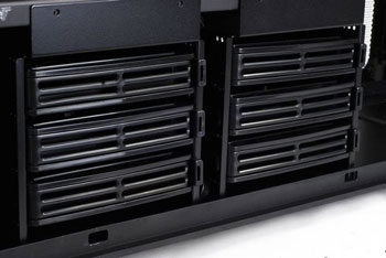 Côté ventilation, en plus de la disposition particulière des composants, signature du constructeur, on retrouve deux 180mm AP181 de la marque pour apporter le flux d'air tandis qu'un 120mm monté sur la façade supérieure se charge de l'évacuation, dans la tradition là encore d'un flux basé sur la pression positive. On peut d'ailleurs voir deux entrebâillements filtrés assez énormes en plein flanc pour alimenter en air frais les quatorze pâles du duo. Deux autres 120mm latéraux sont également de mise pour s'occuper du compartiment HDD en bas du boitier.