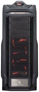 Le refroidissement est confié à deux ventilateurs de 120mm en façade, un ventilateur de 200mm sur le dessus bénéficiant d'un système de filtre anti-poussière et un ventilateur de 140mm en extraction. La connectique en façade est soignée puisqu'elle met à disposition deux ports USB 3.0, deux ports USB 2.0, un port e-SATA et de quoi connecter casque et micro. Une baie hot-swap de 2,5" est également à disposition, ainsi que tout ce qu'il faut pour piloter l'allumage du PC (bouton Power et Reset), la régulation de la ventilation et l'éclairage du boitier. Quant au look, il possède tout ce que les aficionados de la marque apprécient : couleur noire mate, métal mesh, LED rouge et poignée de transport sur le dessus.