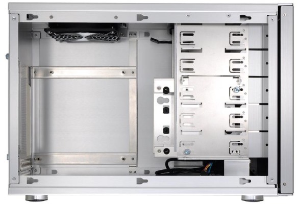 A l'intérieur du bestiau de 21 x 31 x 46 cm on constate que les 3 baies 5.25" du bas sont occupée par une cage à disques durs, comprenant un ventilateur 120mm et la possibilité d'installer en son sein 4 HDD 3.5" + 2 SSD / HDD au format 2.5". Un 5e HDD 3.5" peut lui être fixé directement sur le fond du boîtier. Un second ventilateur de 120mm est installé au sommet du PC-Q35.