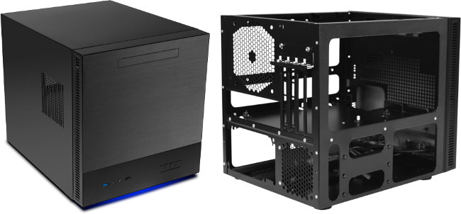 Ce gros bébé a des dimensions de 290 x 272,6 x 340mm, mais sa pudeur l'empêche de divulguer son poids. Son espace interne se présente façon table de bench, la carte mère - au format µATX ou mini-ITX - posée à plat et les lecteurs et l'alimentation intégrant l'étage inférieur. Vous pourrez lui coller jusqu'à trois lecteurs 3,5", quatre 2,5" et le haut du boîtier comprend de quoi glisser un lecteur optique slot-in. Côté ventilation, il est équipé de base d'un 120mm à l'arrière et d'un 140mm à l'avant. Vous pourrez remplacer le ventilateur de façade par deux 120mm et trouverez de quoi glisser un 80mm de plus à l'arrière (en bas). Ses quatre slots d'extensions ne vous permettront pas vraiment d'y coller plus d'une carte graphique (à moins que vous soyez un fana de watercooling plein d'idées) et la bestiole ne devra pas dépasser les 317,5mm. A noter que le côté du boîtier a le droit à une aération pour que l'air chaud du dissipateur de la carte graphique puisse sortir directement.