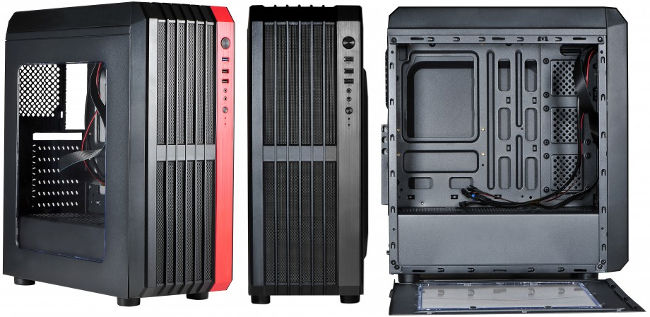 Disponible en noir ou noir et rouge, l'engin fait 380 x 185 x 425mm pour 4,5kg. C'est léger, mais le plastique et l'acier fin, ça ne pèse pas grand-chose. A l'intérieur, vous pourrez coller une mobale au format ATX ou µATX, accompagnée d'un ventirad de 160mm de haut, d'une carte graphique de 370mm de long, d'une alimentation ATX cachée dans un compartiment dédié et de trois lecteurs 3,5"/2,5". Vendu pour satisfaire le joueur, il sera livré avec trois (deux ? le communiqué de presse et leur site ne sont pas d'accord) moulins de 120mm (à DEL rouges) et pourra en recevoir un maximum de neuf, ou du radiateur pour qui aime le watercooling. La connectique E/S se trouve en façade et présente un port USB 3.0, deux USB 2.0 et les connectiques jack audio habituelles. Ils estiment que le bestiau a une durée de vie de cinq années, c'est pourquoi ils le garantissent sur deux années, et il arrive sur le marché dès ce jour à 69,95€ en version noire ou rouge et noire.