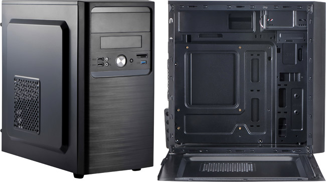 Ce boîtier µATX a des dimensions de 380 x 180 x 370 pour un poids de 2,9kg. Dans la boîte, vous pourrez y placer une carte mère au format µATX ou mini-ITX, un lecteur 5,25" et quatre lecteurs 3,5" ou 2,5". On a deux emplacements pour ventilateurs 120mm à l'avant (un fourni), deux à l'arrière et un autre sur le côté (non fourni). Contrairement à son grand frère, l'alimentation n'est pas incluse (ce qui n'est pas plus mal), celle-ci devra être au format ATX et elle se placera en haut. Pas de folie du côté de la connectique, on retrouvera trois ports USB (un USB 3.0 et deux USB 2.0), deux ports audio et un lecteur de carte (SD/TF). Toujours tout noir et à un tarif de 44,95€ hors taxes (soit 54€ TTC), ce boîtier au tarif encore exagéré devrait plaire aux assembleurs à défaut de plaire à tout le monde.