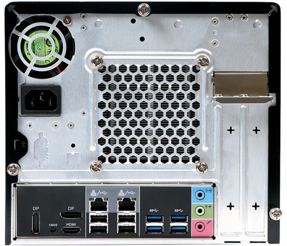Si on regarde le panneau arrière, on a donc deux sorties vidéo DP, une HDMI, un bouton de remise à 0 du bios, 4 ports USB 2.0 surmontés de 2 prises réseau gigabit Intel i211, 4 ports USB 3.0 et les 3 sorties son classiques pilotées par une puce Realtek ALC662. Sur CDH on adore l'ALC651 et 669, mais ça doit pas se trouver partout !