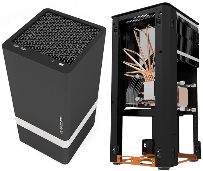Pour ceux qui ne se souviendraient pas ou plus du Monsterlabo First, c'est une tour "premium" passive (bon, à un ventilateur Noctua optionnel près, une semi-hérésie donc) de 7 kg en forme de colonne de 43 cm de haut, capable d'accueillir une configuration mini-ITX, mais avec un attirail intérieur présenté par le constructeur comme étant capable de dissiper la chaleur par exemple d'un duo 8700K et GTX 1080, rien que ça ! Il avait été présenté au Computex en 2018, puis mis en vente à partir d'octobre pour la modique somme de 429€, à nu bien sûr.
