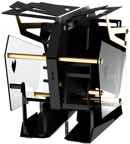 Le T-Wings CMT710 de FSP se démarque indéniablement des modèles ci-dessus avec une conception semi-ouverte en aluminium et verre trempé, qui ne laissera pas indifférente avec son style brute et tuning très (trop ?) particulier. S'il parait symétrique vu de l'extérieur, les deux chambres distinctes du boitier ne le sont pas. La chambre du système principale est celle qui vous permettra de loger une carte mère E-ATX (avec 8 slots d'expansion), une alimentation ATX (240 mm max.), une carte graphique (380 mm max) verticalement ou horizontalement, un ventirad de 155 mm de haut, ainsi qu'un radiateur de 360 mm maximum en façade (ou 3 ventilateurs de 120 mm).