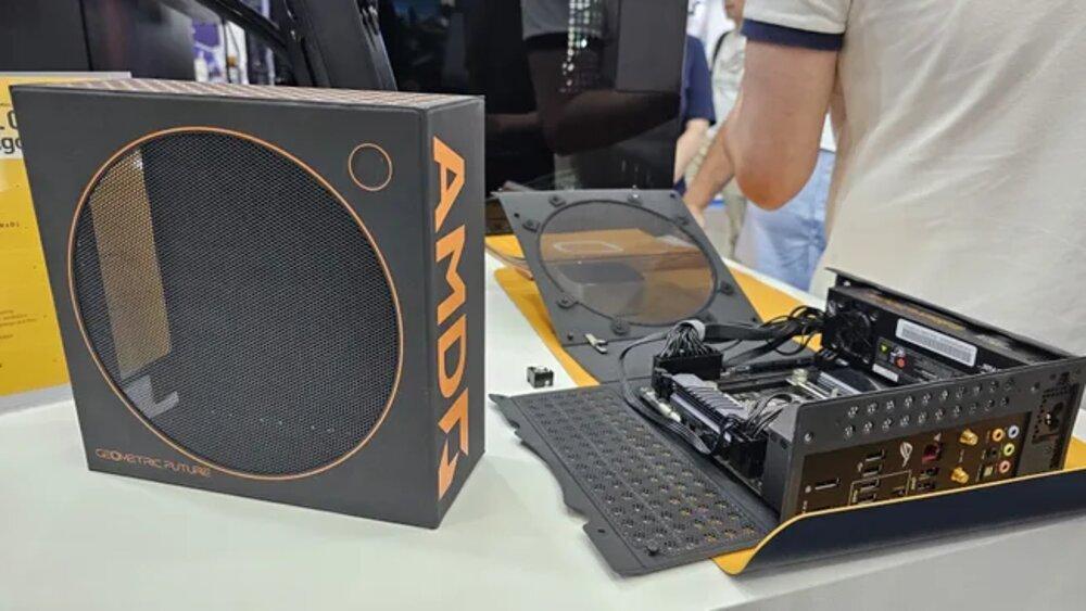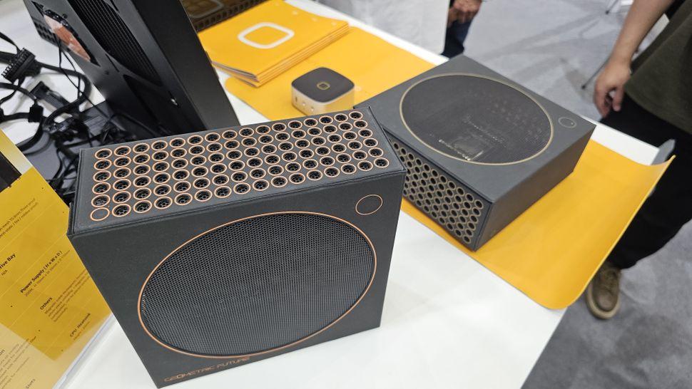 À l’opposé de cette ode à l’IA, le stand Newegg présentait un boîtier SFF atypique, le Model 0 Flamingo de Geometric Future, une société créée par d'anciens employés d'InWin. Le concept : un châssis Mini ITX qui s'enroule littéralement autour du système. Comme vous le constatez sur les images d’illustration, il possède de nombreux trous d'aération, tandis que ses pieds magnétiques permettent de l’orienter à sa guise.