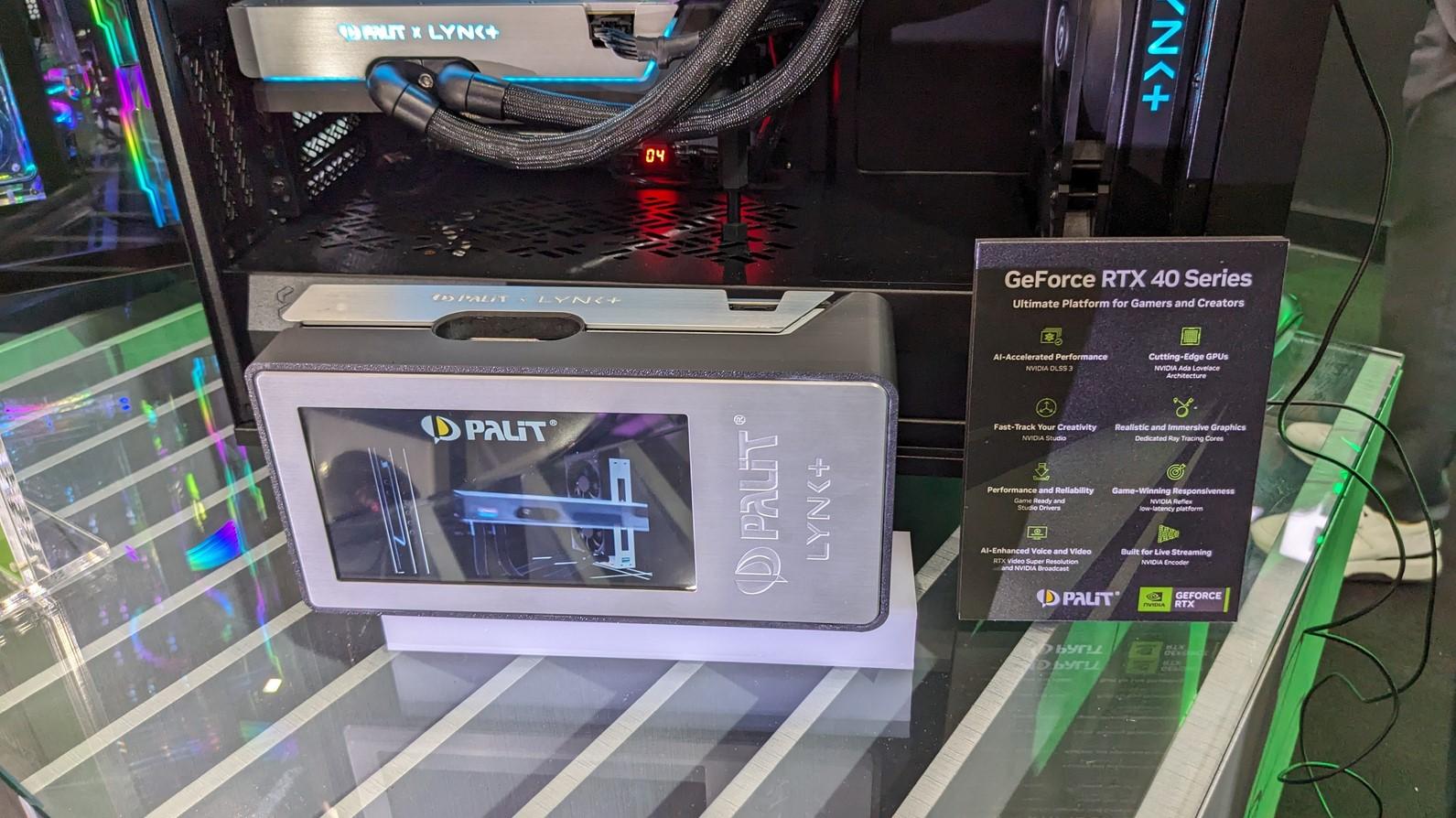 Dans un registre similaire, voici la solution élaborée par Palit et Lynk+ pour refroidir une GeForce RTX 4090 : un waterblock modulaire muni d’un écran de 7 pouces, que der8auer avait présenté quelques jours avant le salon dans la vidéo ci-dessous.