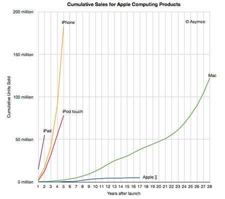 On le sait, Apple s'est gavé comme un porcif en 2011, la firme à la pomme ne connait pas du tout la crise. Ses chiffres de ventes sont faramineux, consultables sur cette news concernant son dernier trimestre fiscal. Le petit Horace Dediu de la société Asymco a fait un constat amusant en recoupant les chiffres de vente de tous les produits Apple depuis la création de l'entreprise il y a 28 ans.