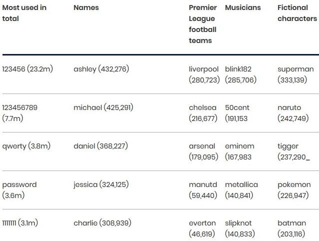 Ça fait des années, mais le constat est toujours aussi triste ! On retrouve ainsi énormément de classiques du mot passe pourri de base comme 123456(789) et qwerty, mais aussi beaucoup de prénoms (visiblement, Ashley est toujours à la mode) et des équipes de foot. Bref, la liste très complète et très longue du NCSC - entièrement visible ici - n'a vraiment rien à envier ni à faire valoir face au contenu d'autres listes publiées au fil des années par de multiples organismes de recherche, par exemple en 2010, 2012, 2015 ou encore 2016...