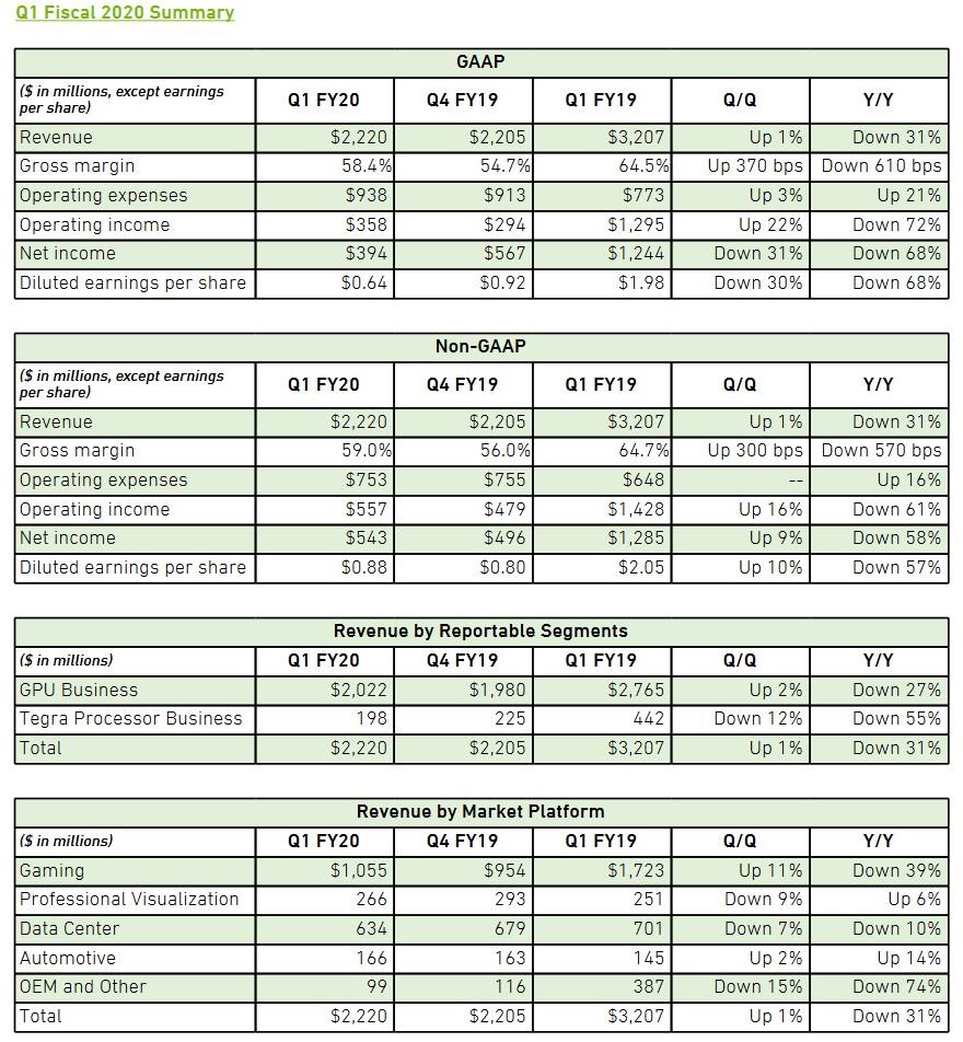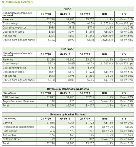 Bref, l'ambiance Q1 2020 était un pwal meilleure, les chiffres sont un peu plus verts et les actionnaires vont pouvoir encaisser la somme formidable de 0,16$ par action. Pour finir, ci-dessous tous les chiffres en question. On notera tout de même que NVIDIA n'a pas partagé de résultat cible prévisionnel pour l'année entière, un point qui ne plaît pas toujours aux actionnaires et peut en dire long des attentes de la compagnie pour l'année à venir. (Source : NVIDIA)