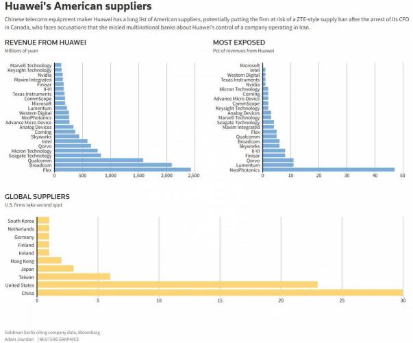 Sans chercher à partir aussi loin dans les tréfonds mystérieux cette affaire avec sa boule de cristal entre les griffes, Goldman Sachs - l'un des autres faiseurs de la pluie et du beau temps - en bon patriote a compilé une liste de futurs ex-fournisseurs américains de Huawei afin de mieux mettre en évidence les impacts prévisionnels sur les revenus et constater lequel aurait le plus à perdre.