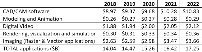 Le segment logiciel est plus calme - il faut dire qu'il suit la tendance matérielle en hausse - d'autant plus que le domaine de la VR refait surface du côté des startups ces derniers temps : enfin l'adoption de masse tant attendue ? Notons enfin la domination des softwares de conception et design assistés par ordinateur, qui forment le plus gros du lot-giciel : bien que passé sous silence dans les médias du fait d'images moins sensationnelles, c'est finalement lorsque le virtuel se couple au réel que la majorité du développement est fait.