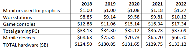 Qu'il s'agisse du côté matériel ou logiciel, les deux composants du gros gâteau de près de 150 milliards de dollars - le premier comptant pour un énorme 85% de la somme - se verraient en augmentation légère de 2% pour les deux années à venir. Si cela semble peu, il faut rapporter à la somme totale... qui représente quelque 3 milliards de dollars, autant dire que le secteur est porteur. Si la plupart des secteurs sont dans le vert, nous notons une baisse substantielle du segment mobile arrivé à plus que saturation qui dévisserait de 10 milliards de dollars entre 2019 et 2022, de quoi retourner plus bas que son niveau de 2018.