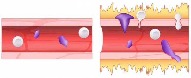 Comme ceci. Le vaisseau sanguin normal à gauche, le vaisseau avec des fuites de liquide (en jaune) à droite) à cause de l'hyperactivité de la bradykinine.