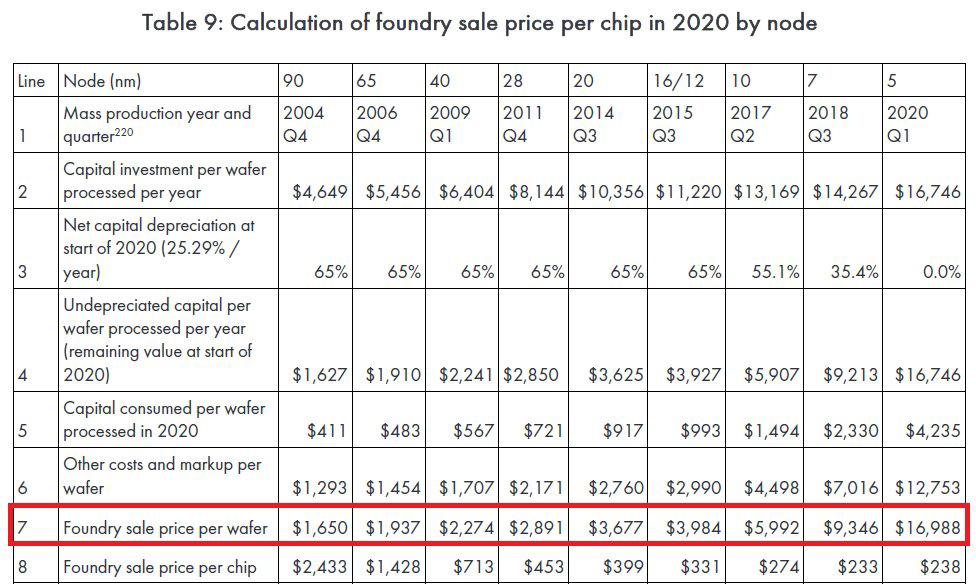 L’individu insiste (et nous aussi d’ailleurs) qu’il s’agit uniquement d’estimations, certes apparemment rigoureuses ! Les données utilisées seraient celles du mois d’avril. Attention, concernant le 5 nm, le calcul ne prendrait pas en compte la production initiale avec ses rendements traditionnellement faibles et se base sur une puce hypothétique en 5 nm de 90,7 milliards de transistors avec les spécifications du GPU P100 de Nvidia. Le prix par puce ne serait donc pas particulièrement valide.