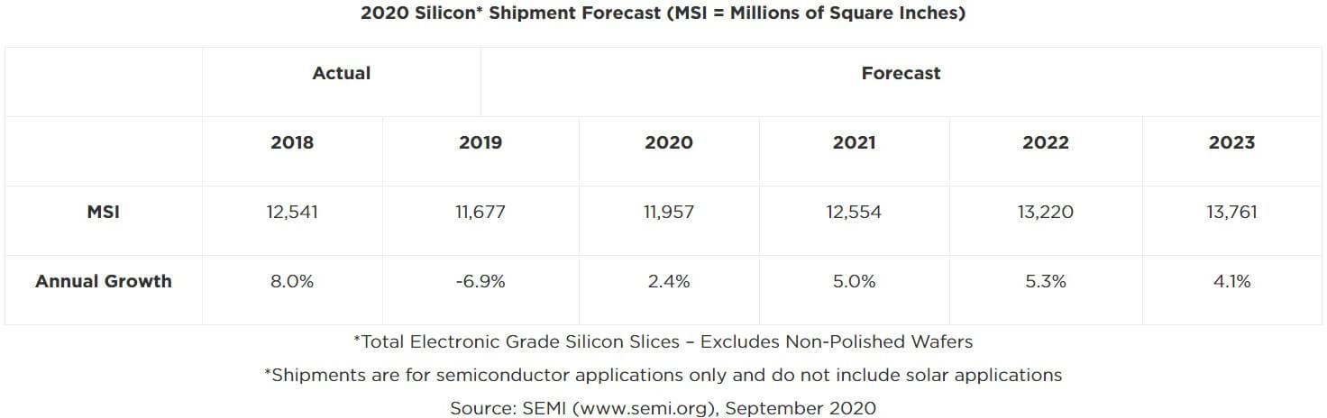 Les prédictions de SEMI s'étendent jusqu'à 2023, d'ici là le groupe anticipe une croissance annuelle de 2,4 % pour 2020, qui continuera en 2021 et signera un nouveau record en 2022 avec 13,22 millions de pouces de wafer livrés. Il faut préciser que ces chiffres concernent les wafers polis de 1 à 12 pouces et ceux destinés à une exploitation pour des semiconducteurs, excluant les usages types solaires.