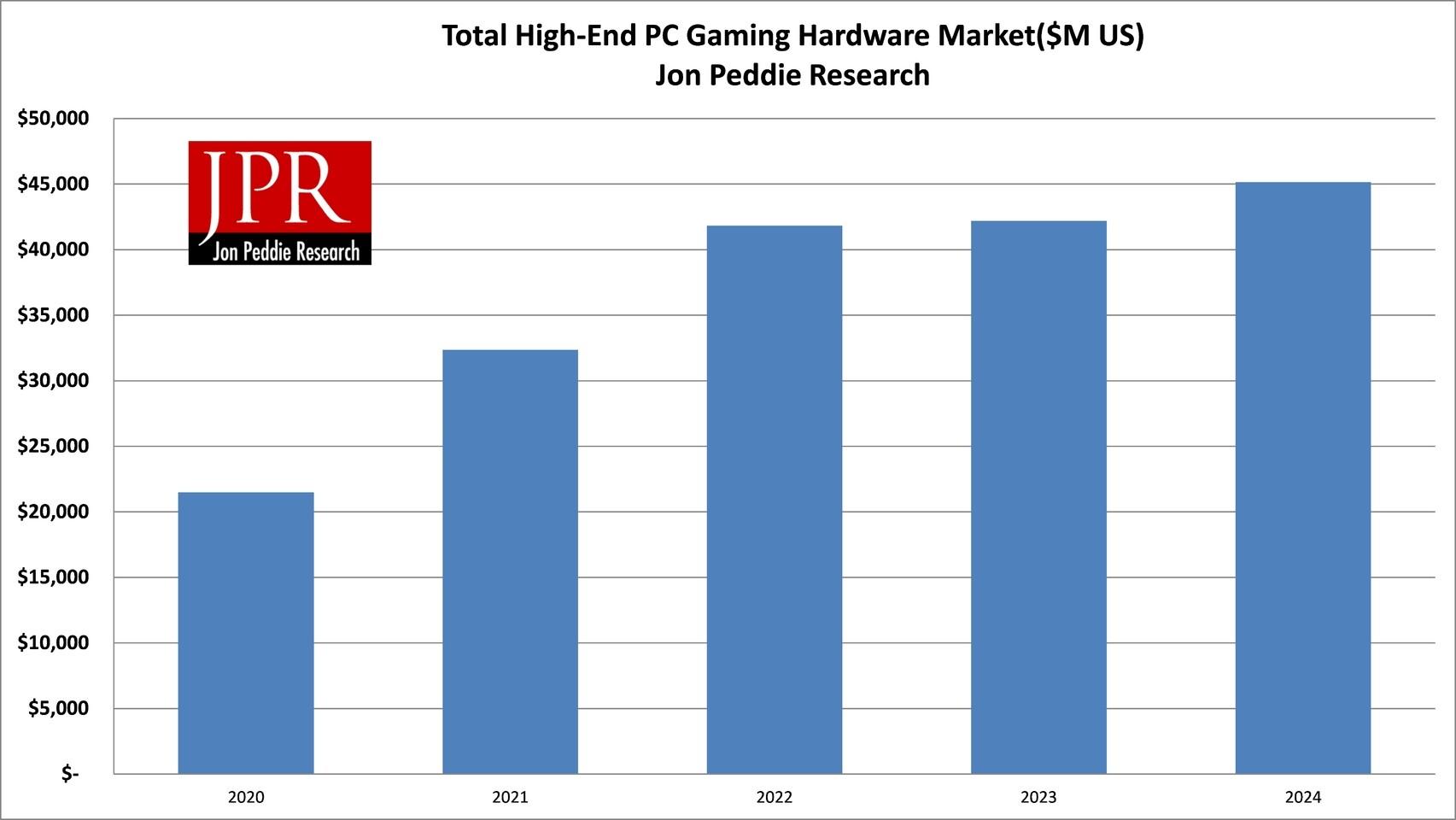 La dernière analyse du marché de materiel de PC destiné au gaming a été publiée par Jon Peddie Research, une étude qui s'intéresse tout particulièrement à la vente de PC, de composants et de périphériques utilisés pour s'adonner au gaming. Tout d'abord, JPR note que le marché en question a simultanément été florissant et en souffrance. Ainsi, financièrement ce commerce s'en est exceptionnellement bien sorti, mais pas forcement de la manière attendue, la majorité des grosses sommes dépensées par les joueurs n'ayant apparemment pas été encaissés par les fabricants, mais par les revendeurs ayant pratiqué des tarifs assez dingues en se servant des problèmes d'approvisionnement comme justification. Ah, la belle loi de l'offre et de la demande...