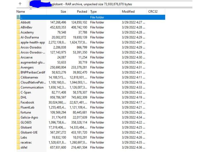 On voit sur la capture d'écran partagée par LAPSUS$ des dossiers au nom d'Arcserve, Banco Galicia, BNP Paribas Cardif, Citibanamex, Facebook, DHL, Stifel et beaucoup d'autres. La fuite aurait également affecté l'application BeHealthy de Globant, un logiciel conçu en collaboration avec Apple pour son Apple Watch et le suivi de la santé de ses employés. Selon le groupe de recherche de malware VX-Underground, les mots de passe présents dans la fuite sont particulièrement faciles à deviner et ceux-ci auraient été utilisés plusieurs fois, ce qui a d'ailleurs poussé LAPSUS$ à pointer du doigt le manque de sérieux de la compagnie en matière de sécurité...