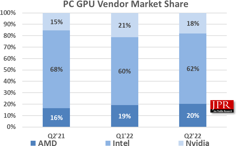 Commençons par les parts de marché. De ce côté-là, quelques petits changements depuis le dernier trimestre, des gains pour AMD et Intel, qui se sont donc faits aux dépens de NVIDIA, à nouveau numéro 3 du classement. Mais attention, on rappelle que ces chiffres prennent en compte les GPU intégrés (APU, IGP) et dédiés. On notera aussi les gains relativement significatifs d'AMD depuis Q2 2021.