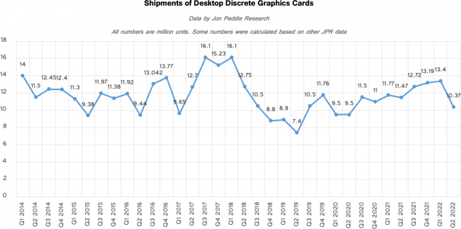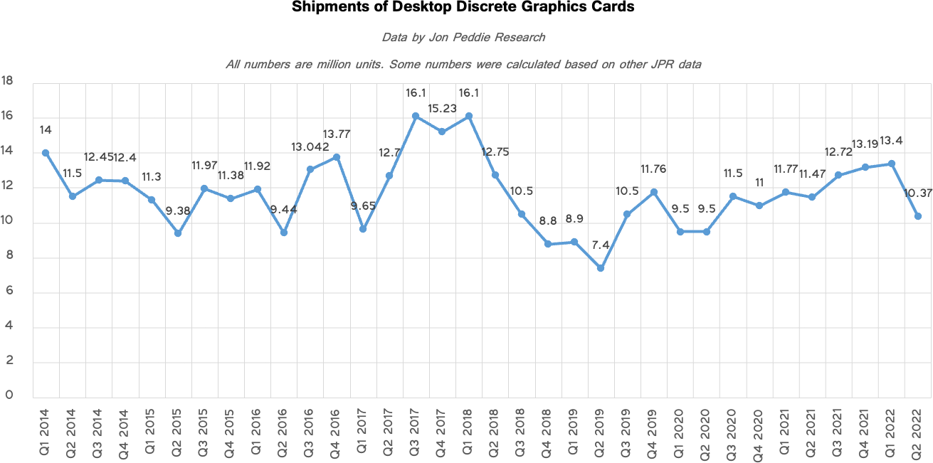 Enfin, JPR fait aussi remarquer que les ventes de cartes graphiques dédiées ont atteint leur plus bas niveau depuis Q2 2020, avec 10,37 millions d'unités livrées pendant le trimestre, soit un déclin trimestriel de pas moins de 22,6 %... Compte tenu du contexte actuel, il est difficile selon JPR de faire des prédictions pour la suite. L'avenir nous dira si les nouvelles générations auront réussi à avoir un effet positif sur ce marché au beau milieu d'une période de tourmente mondiale, dont la fin ne semble pas encore être à l'horizon. Joyeux, n'est-ce pas ? (Source)