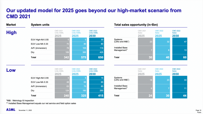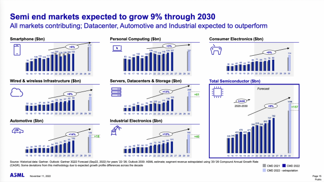 Le néerlandais a tenu son Investor Day 2022 l'autre jour et en cette occasion a partagé ses attentes et ses prévisions pour l'industrie pour les années à avenir. À contre-courant de l'ambiance générale, ASML est très optimiste pour ce futur relativement proche et estime que toutes les prévisions faites jusqu'à présent seront systématiquement dépassées au moins jusqu'en 2030, et ce en grande partie grâce aux différents projets majeurs édictés en faveur du semiconducteur par les USA, l'Europe et en Asie avec de grosses subventions à la clé.