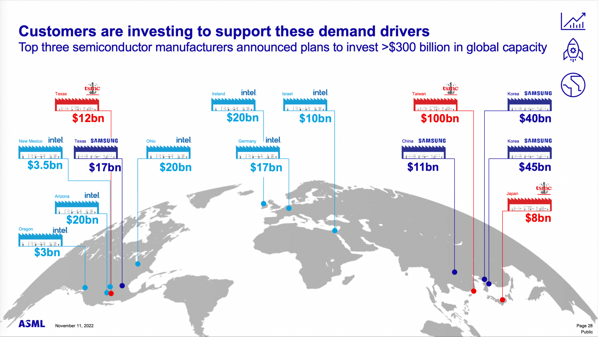Résumé des investissements actuels par le trio magique du semiconducteur Intel, Samsung et TSMC dans le monde. Oui, ça en fait des dollars ! ASML le sait aussi ;) De plus, n'oublions pas qu'il n'y a pas que ces trois-là.